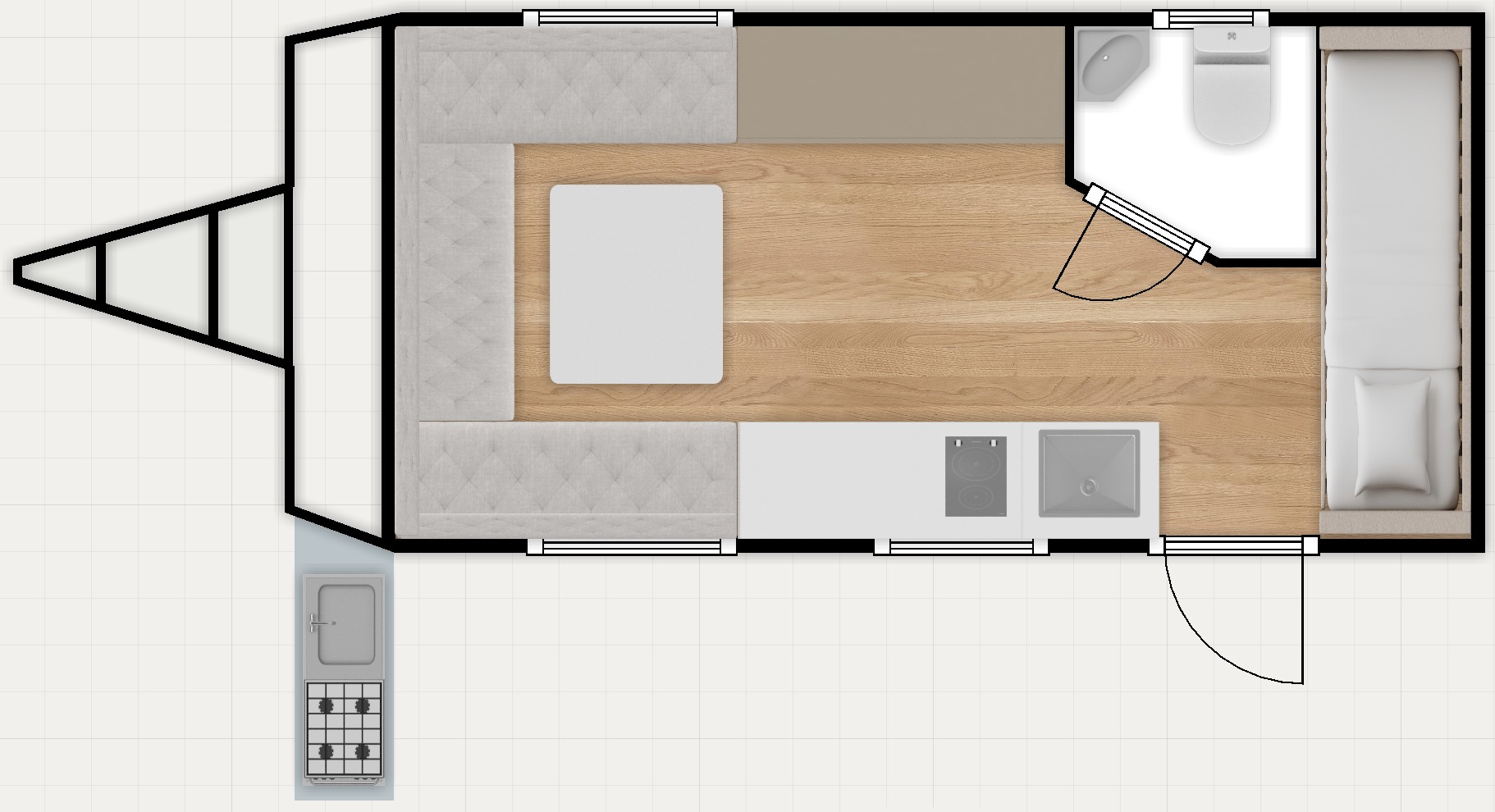 The Sigma-15 is built for effortless travel, featuring both indoor and outdoor kitchens, a full bathroom with shower and toilet, and comfortable sleeping space for up to four people. Slightly longer by 0.8 meters than the Sigma-13, it offers extra storage space. Perfect for long journeys or travellers who need plenty of room for their gear.