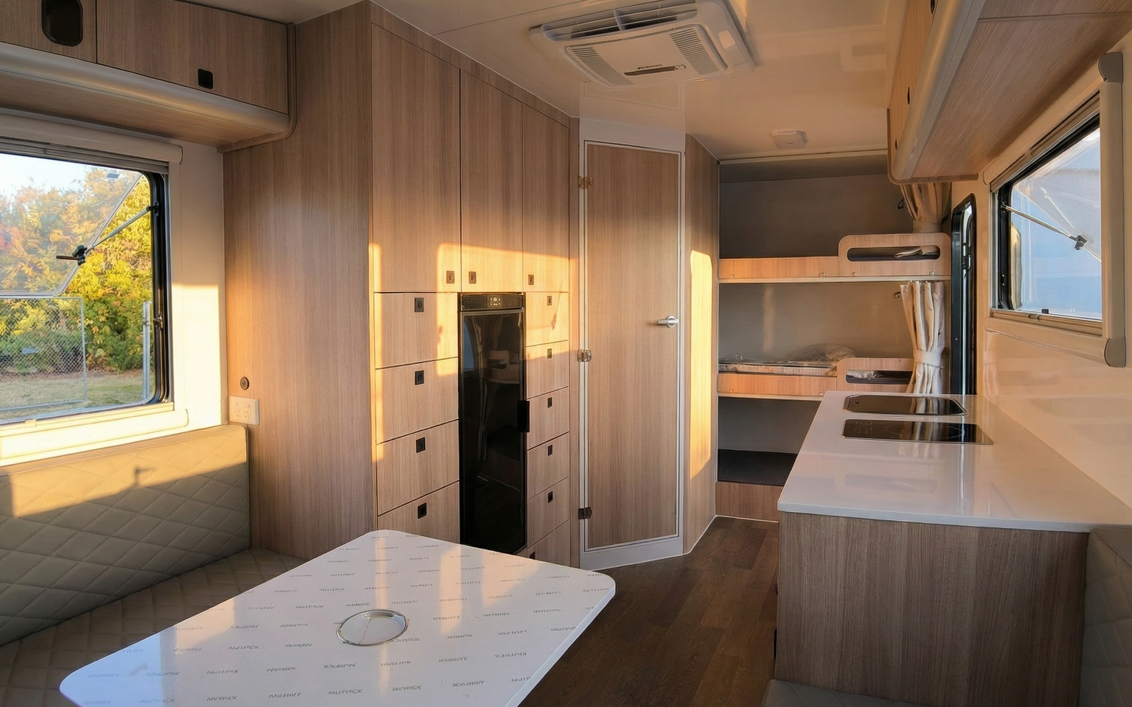The exterior of our caravan combines durability with style, built to withstand Australian weather conditions. High-quality cladding, insulated wall panels, and weather-resistant finishes ensure long-lasting performance in any climate. A clean, modern front façade delivers a timeless look, while the engineered, reinforced chassis makes towing safe and effortless. Compact yet elegant, every detail is designed for both practicality and sophistication.