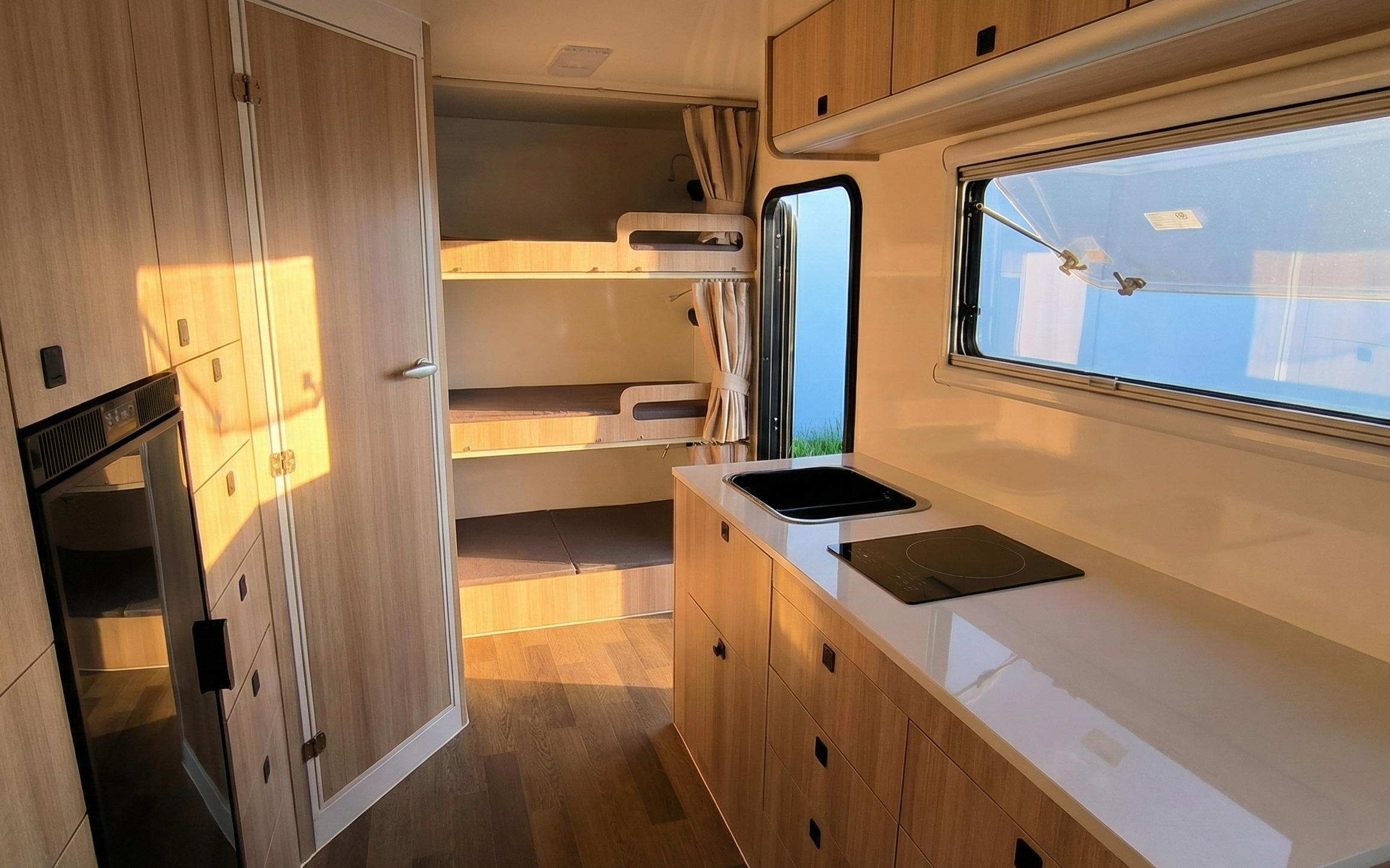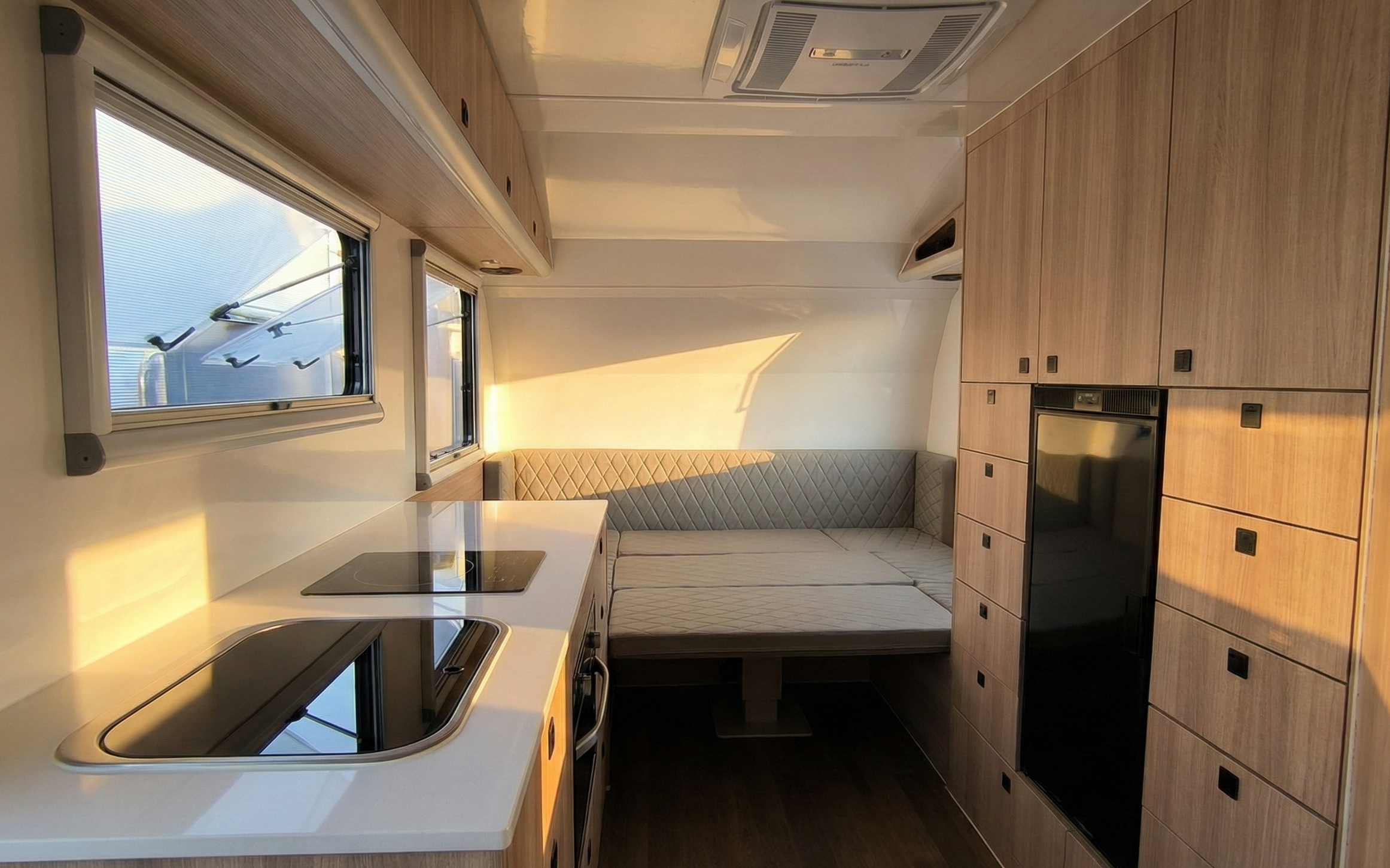 The caravan interior is warm, bright, and thoughtfully designed for camping and adventure. A smart layout maximizes usable space, featuring built-in storage, a functional kitchen, a comfortable bathroom, and flexible living areas. Premium finishes, soft lighting, and energy-efficient appliances create a cozy, inviting environment for your journey.